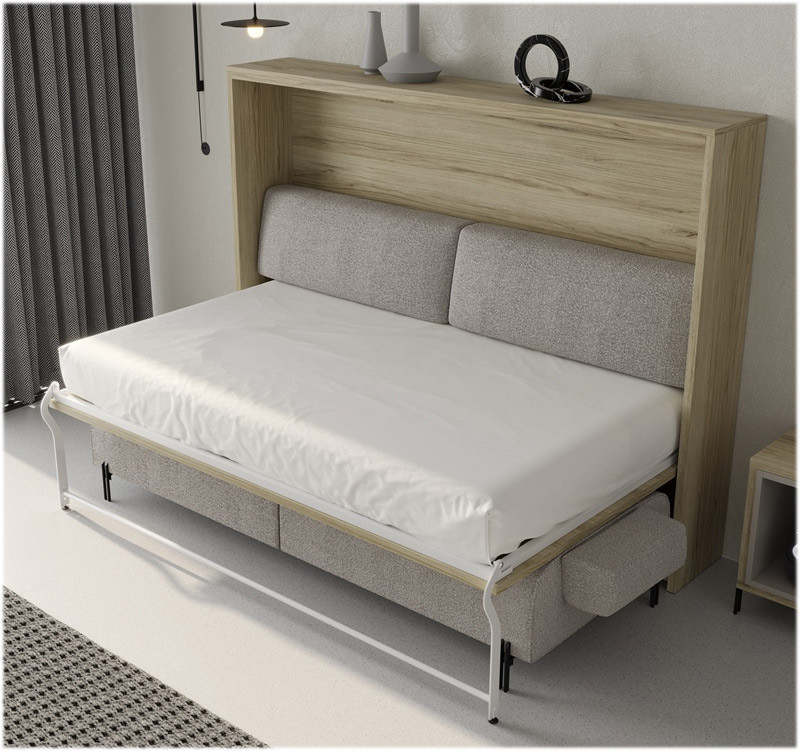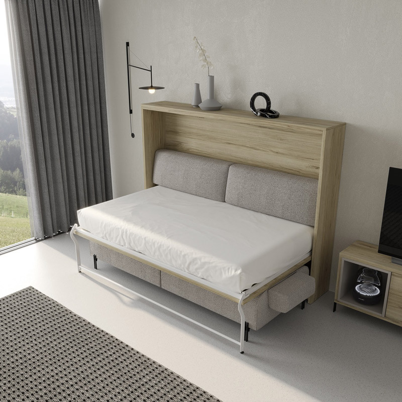 La cama se abre HORIZONTALMENTE, siendo una opción ideal para las habitaciones de reducido tamaño. El hueco interior permite el uso de UN COLCHÓN CON UNA ALTURA MÁXIMA DE 20 Y 26 CM DEPENDIENDO DEL FONDO DE LA CAMA ELEGIDO.