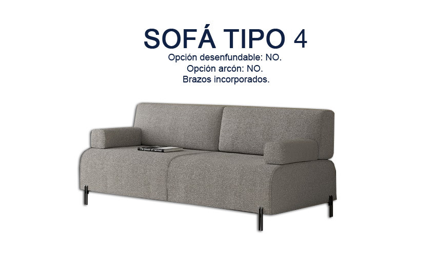Sofá con estructura en Madera de pino y tablero de partículas. los asientos disponen de cinchas elásticas tipo Nea, espumación Hr de 30 Kg de densidad recubierto con fibra. Respaldo s confeccionado en bloque de espuma de 25 Kg de densidad recubierto con fibra. OPCIONAL ASIENTOS DESENFUNDABLES Y CON ARCÓN BAJO LOS ASIENTOS (NO DISPONIBLE EN SOFÁ MODELO TIPO 3).