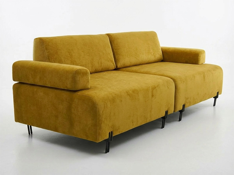Sofá con estructura en Madera de pino y tablero de partículas. los asientos disponen de cinchas elásticas tipo Nea, espumación Hr de 30 Kg de densidad recubierto con fibra. Respaldo s confeccionado en bloque de espuma de 25 Kg de densidad recubierto con fibra.