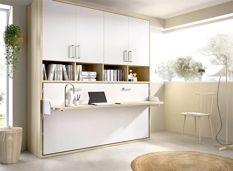 MI CAMA ABATIBLE LES PRESENTA ESTE PRÁCTICO MUEBLE ABATIBLE CON ESCRITORIO Y ARMARIO SUPERIOR CON EL QUE PODRÁ DISPONER DE UNA ZONA EXTRA DESPEJADA EN LA HABITACIÓN.