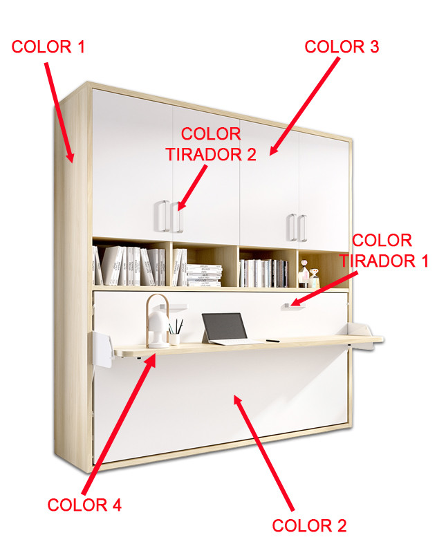 DISPONE DE ESCRITORIO ABATIBLE SINCRONIZADO CON LA APERTURA QUE LE DA UNA FUNCIONALIDAD EXTRA A LA CAMA. El acabado exterior en TABLERO MELAMÍNICO le confiere una especial resistencia a las ralladuras y manchas. Se puede fabricar en una amplia gama de colores (Colores Base para la estructura exterior y Colores Base y de Combinación para la puerta).