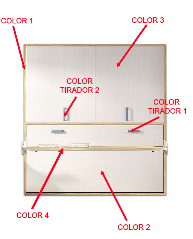 DISPONE DE ESCRITORIO ABATIBLE SINCRONIZADO CON LA APERTURA QUE LE DA UNA FUNCIONALIDAD EXTRA A LA CAMA. El acabado exterior en TABLERO MELAMÍNICO le confiere una especial resistencia a las ralladuras y manchas. Se puede fabricar en una amplia gama de colores (Colores Base para la estructura exterior y Colores Base y de Combinación para la puerta).