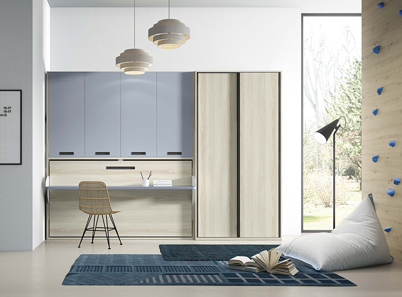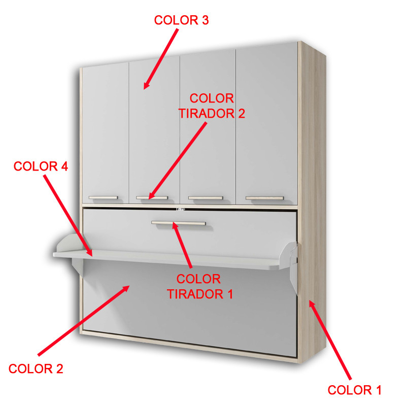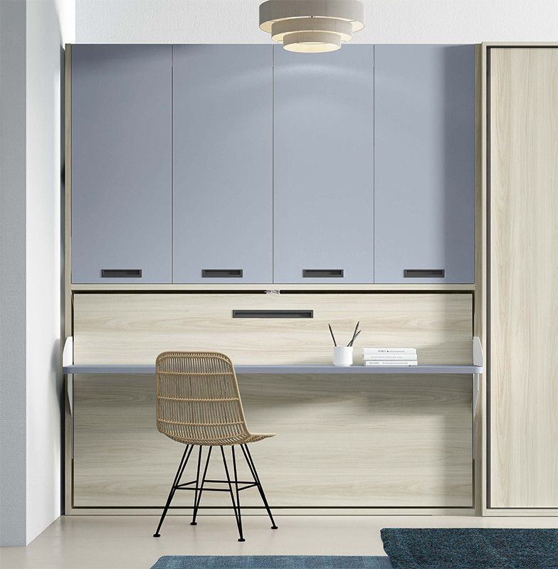 DISPONE DE ESCRITORIO ABATIBLE SINCRONIZADO CON LA APERTURA QUE LE DA UNA FUNCIONALIDAD EXTRA A LA CAMA. Esta cama es ideal para habitaciones de pequeñas dimensiones ya que al estar cerrada sus reducidas dimensiones permiten una zona abierta que se puede usar para el juego de los mas pequeños o el trabajo de los mayores. Su carta de colores permiten una fácil intregración con el resto del mobiliario de la estancia.