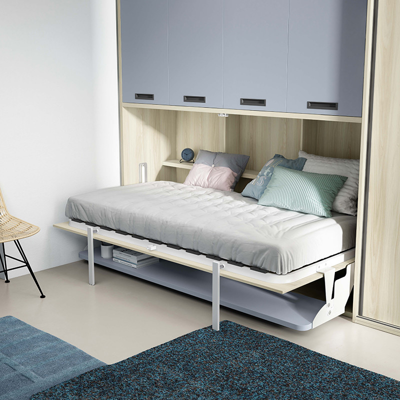 La cama se abre HORIZONTALMENTE, siendo una opción ideal para las habitaciones de reducido tamaño. El hueco interior permite el uso de UN COLCHÓN CON UNA ALTURA MÁXIMA DE 22 CM. DISPONIBLE EN FONDOS DE 40 Y 57 CM.