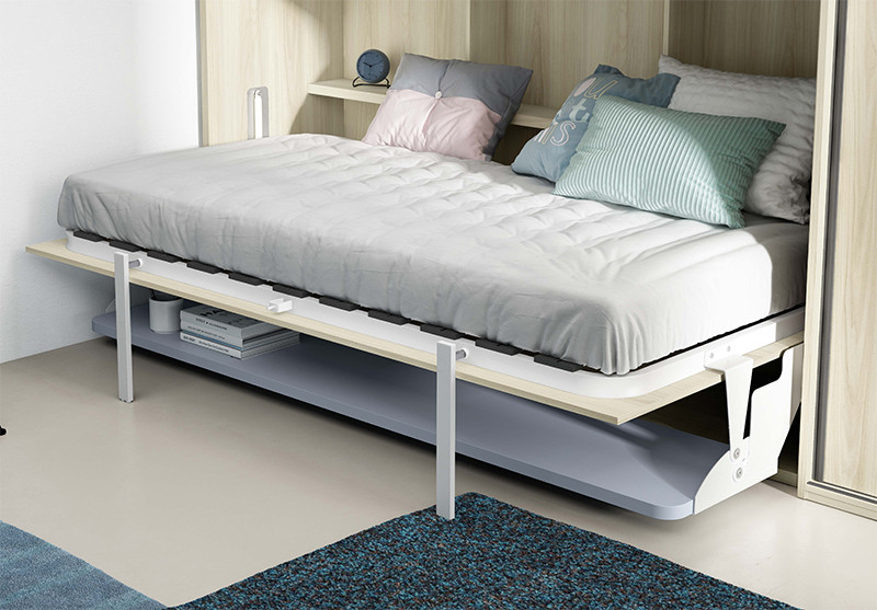 La cama se abre HORIZONTALMENTE, siendo una opción ideal para las habitaciones de reducido tamaño. El hueco interior permite el uso de UN COLCHÓN CON UNA ALTURA MÁXIMA DE 22 CM. DISPONIBLE EN FONDOS DE 40 Y 57 CM.