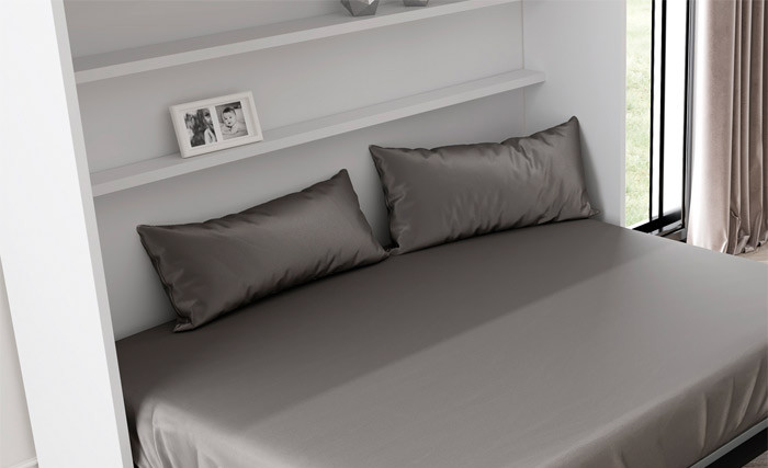 La cama se abre HORIZONTALMENTE, siendo una opción ideal para las habitaciones de reducido tamaño. El hueco interior permite el uso de UN COLCHÓN CON UNA ALTURA MÁXIMA DE 20 Y 26 CM DEPENDIENDO DEL FONDO DE LA CAMA ELEGIDO.