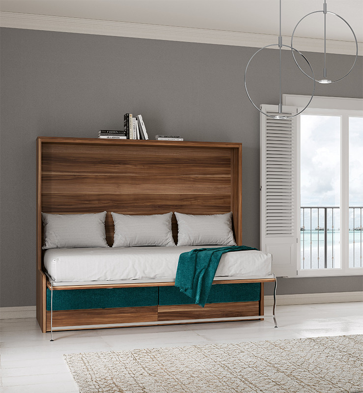 La cama se abre HORIZONTALMENTE, siendo una opción ideal para las habitaciones de reducido tamaño. El hueco interior permite el uso de COLCHONES CON UN MÁXIMO DE 20 CM DE ALTURA.