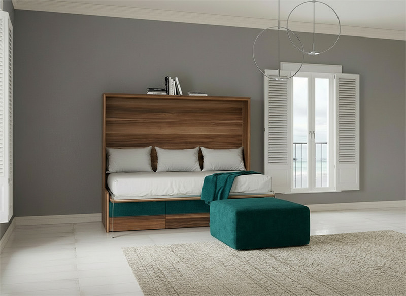La cama se abre HORIZONTALMENTE, siendo una opción ideal para las habitaciones de reducido tamaño. El hueco interior permite el uso de COLCHONES CON UN MÁXIMO DE 20 CM DE ALTURA.