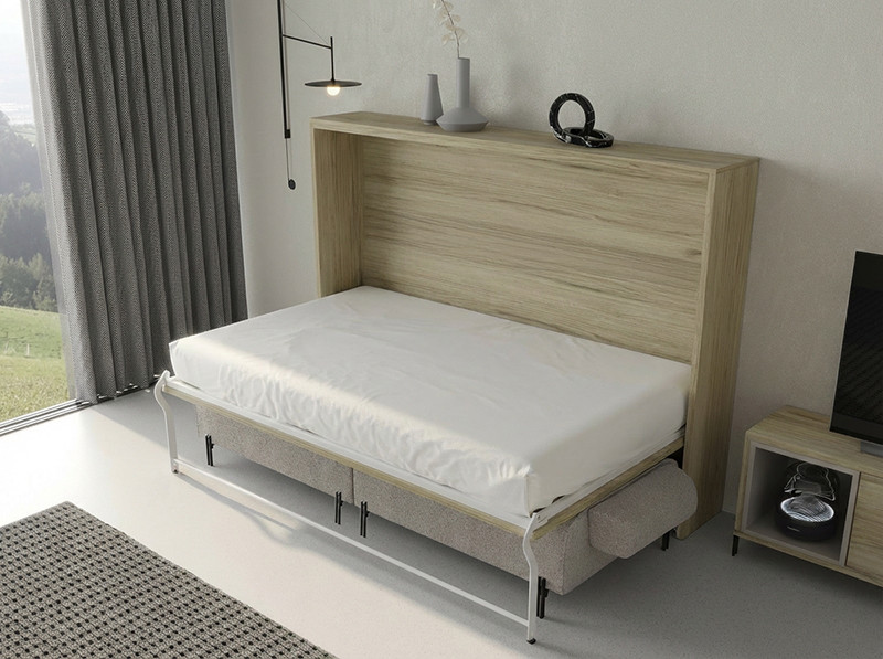 La cama se abre HORIZONTALMENTE, siendo una opción ideal para las habitaciones de reducido tamaño. El hueco interior permite el uso de COLCHONES CON UN MÁXIMO DE 20 CM DE ALTURA.